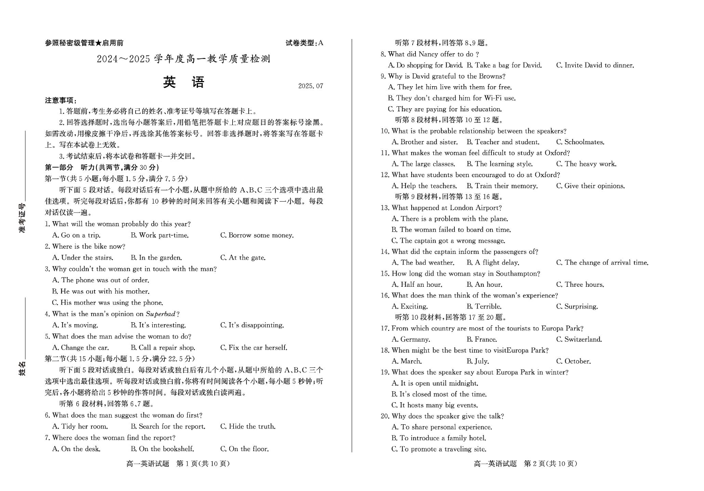 高一英语+答案--山东省枣庄市2024-2025学年高一下学期期末考试
