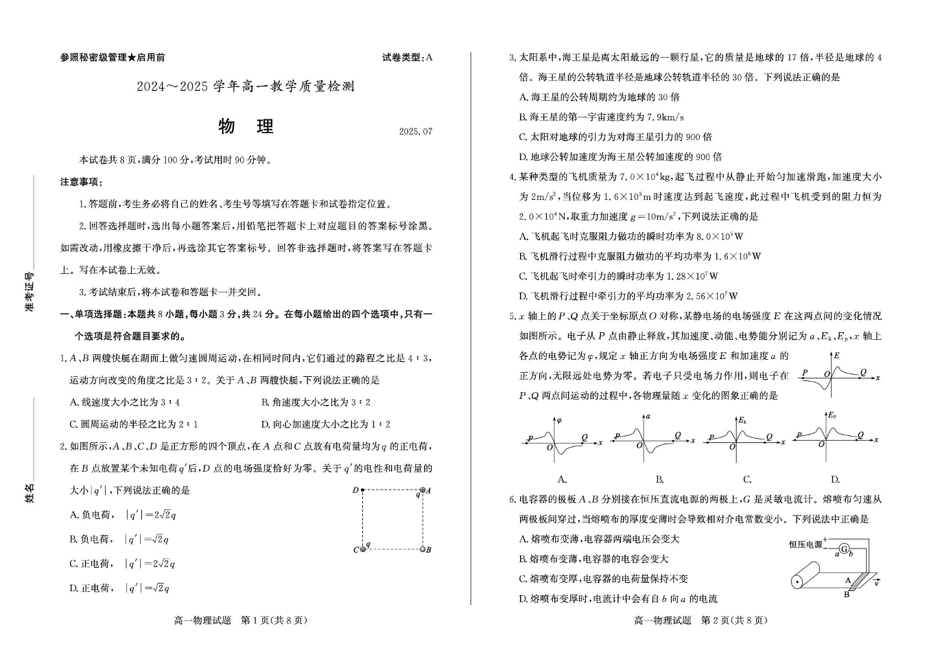 高一物理+答案--山东省枣庄市2024-2025学年高一下学期期末考试