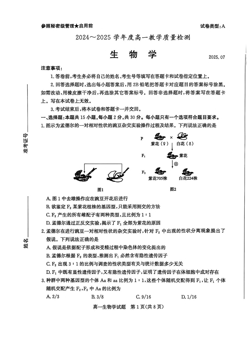 高一生物+答案--山东省枣庄市2024-2025学年高一下学期期末考试