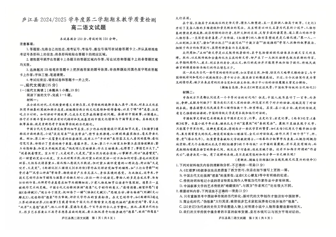 高二语文+答案--安徽省合肥市庐江县2024-2025学年高二下学期期末
