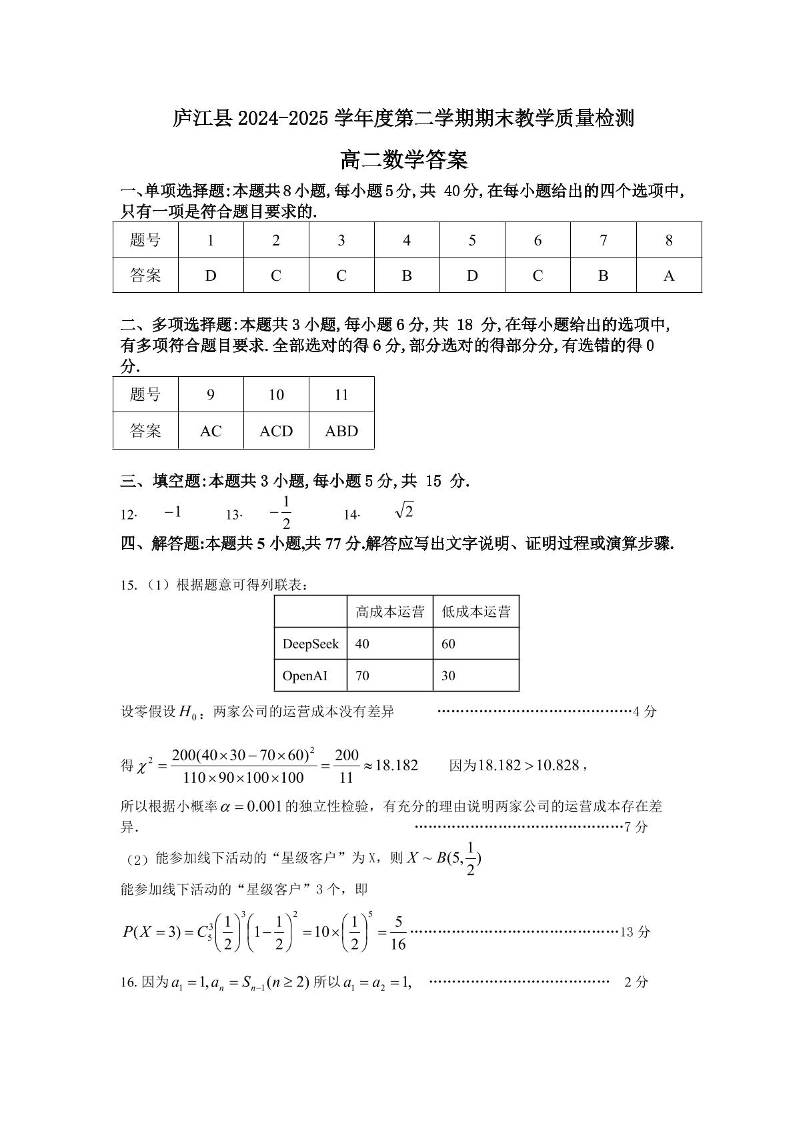 高二数学答案--安徽省合肥市庐江县2024-2025学年高二下学期期末