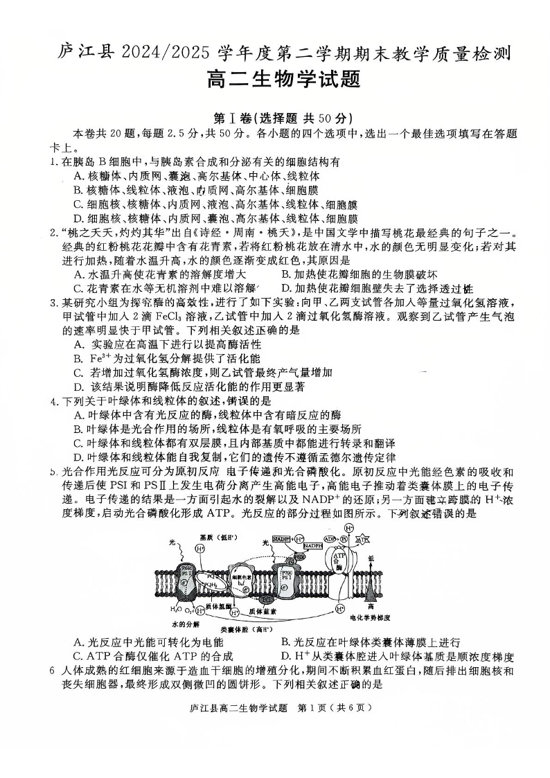 高二生物--安徽省合肥市庐江县2024-2025学年高二下学期期末