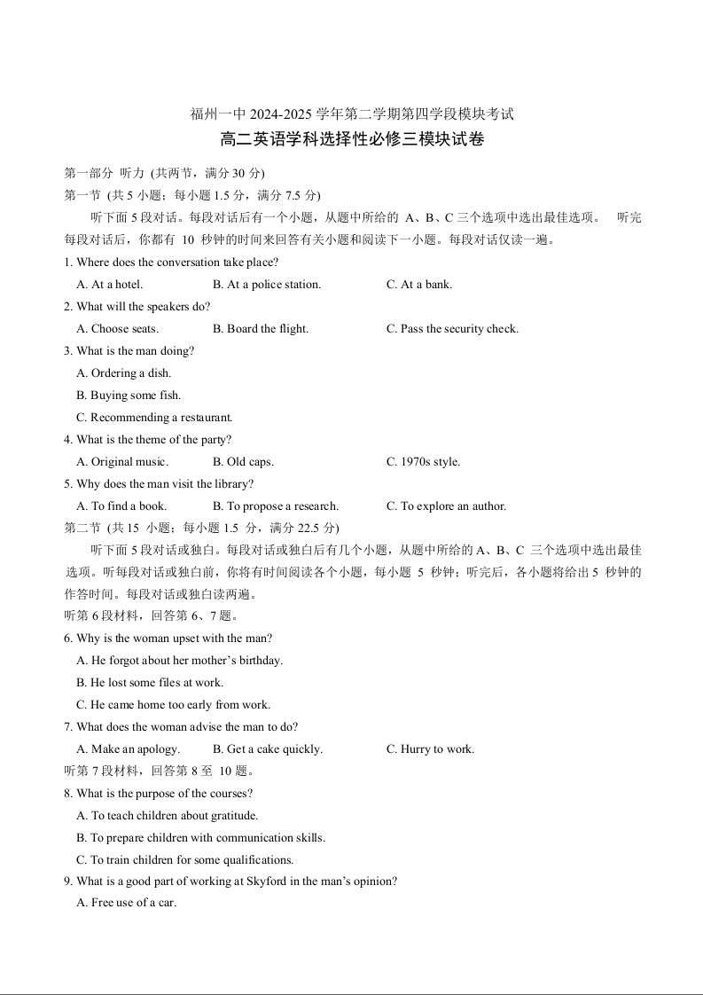 高二英语+答案--福建省福州第一中学2024-2025学年高二下学期7月期末考试