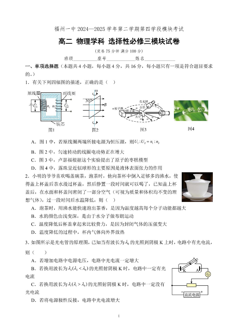 高二物理+答案--福建省福州第一中学2024-2025学年高二下学期7月期末考试