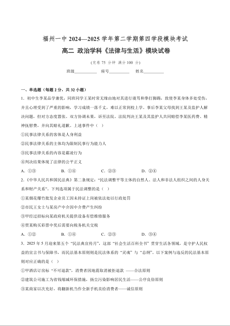 高二政治+答案--福建省福州第一中学2024-2025学年高二下学期7月期末考试