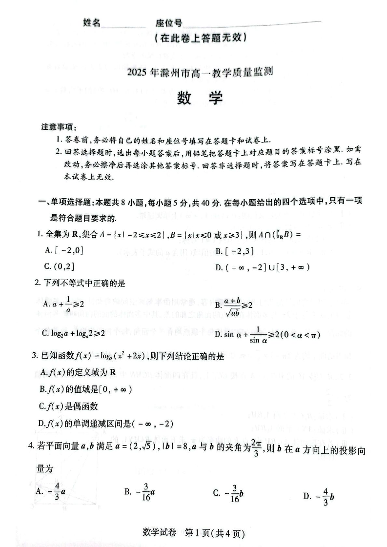 高一数学+答案--安徽省滁州市2024-2025学年高一下学期期末考试