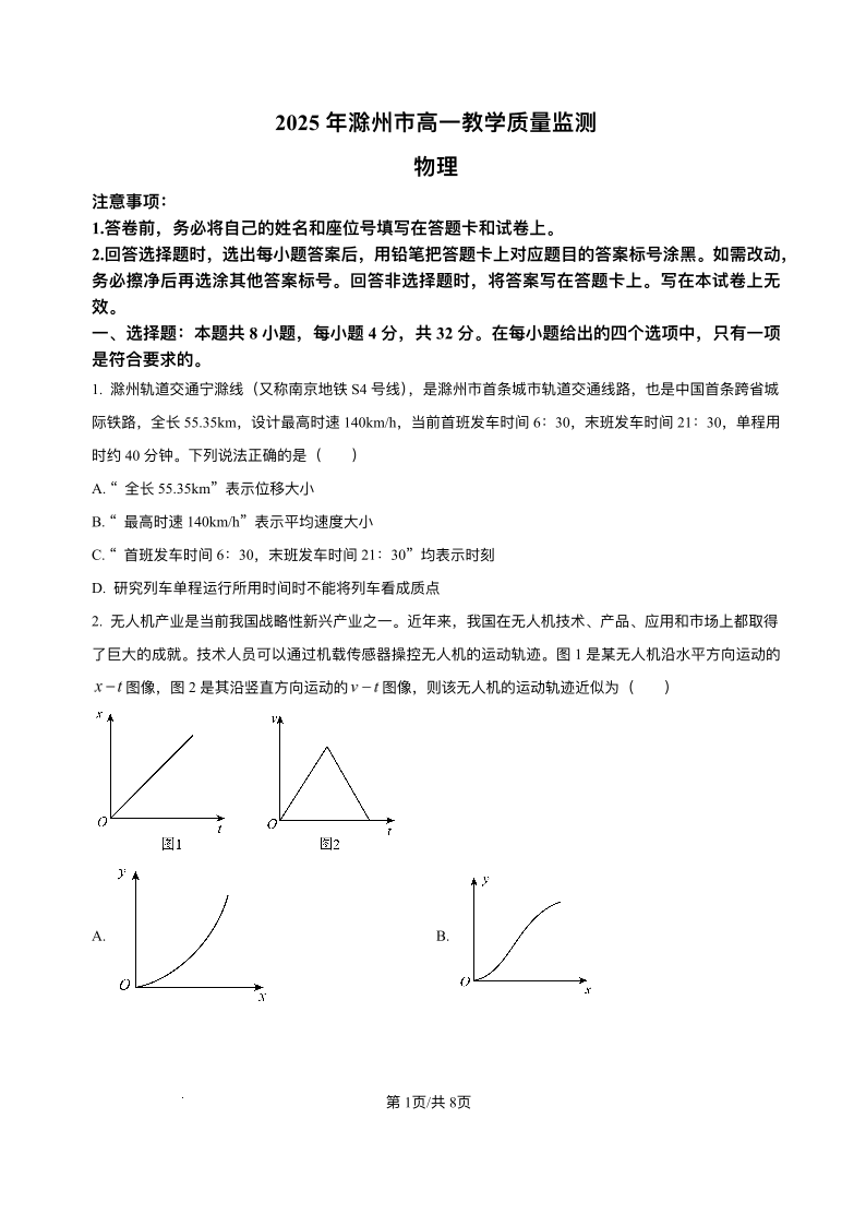 高一物理+答案--安徽省滁州市2024-2025学年高一下学期期末考试