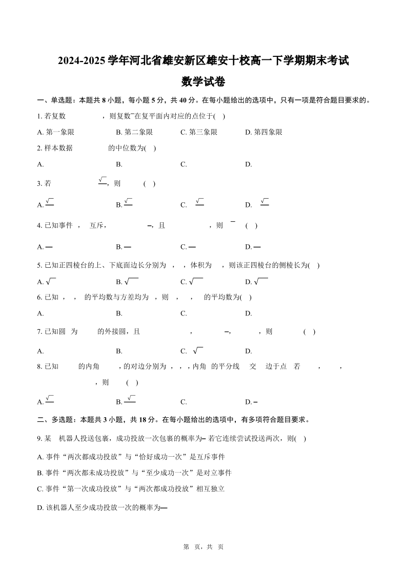 高一数学+答案--河北省雄安新区雄安十校2024-2025学年高一下学期期末考试