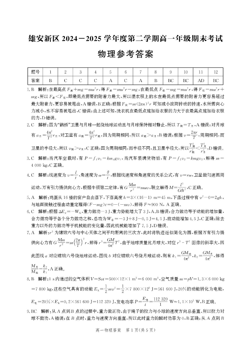 高一物理答案--河北省雄安新区雄安十校2024-2025学年高一下学期期末考试