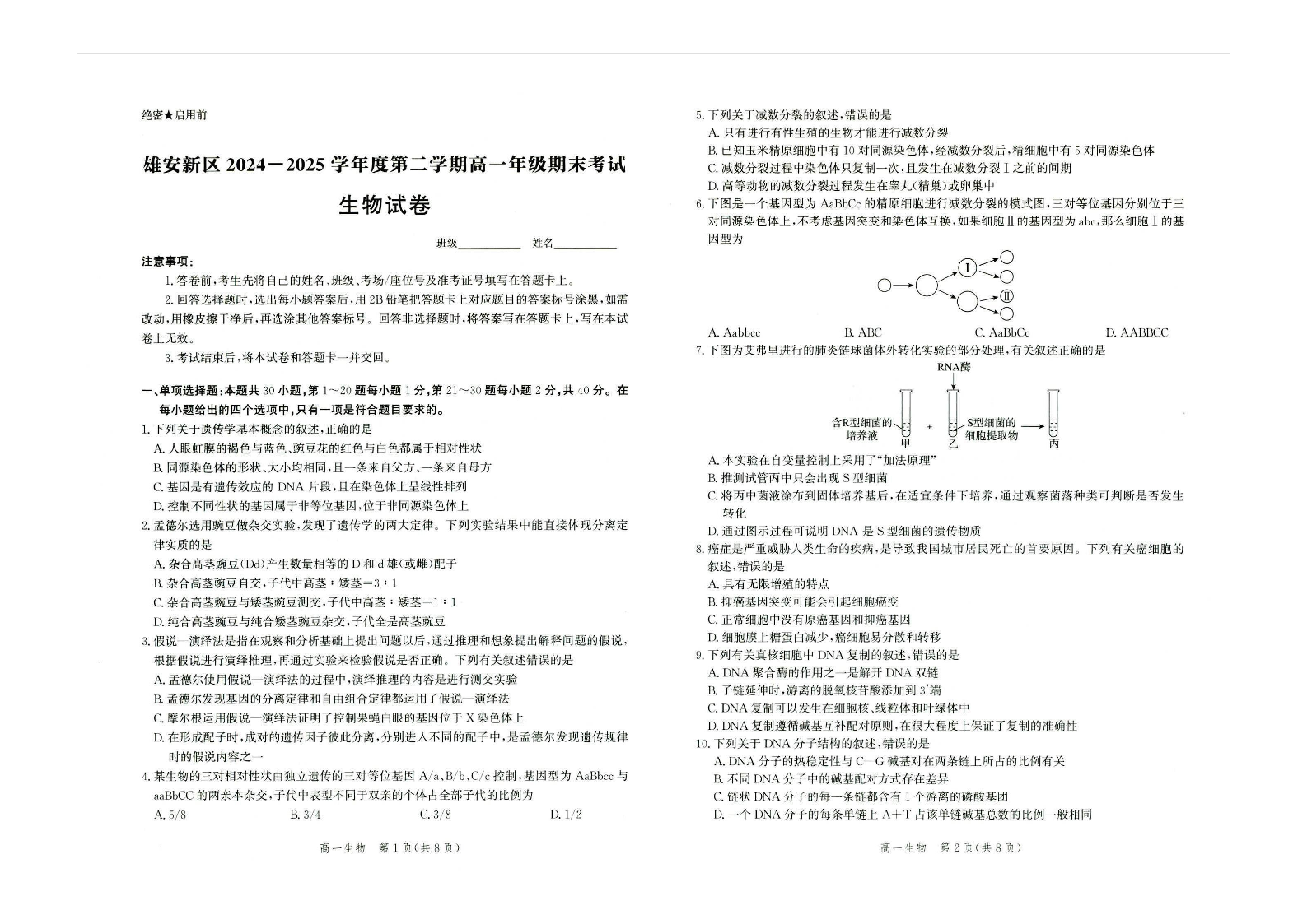 高一生物--河北省雄安新区雄安十校2024-2025学年高一下学期期末考试