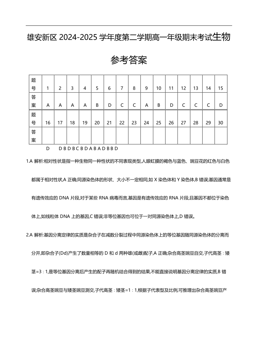 高一生物答案--河北省雄安新区雄安十校2024-2025学年高一下学期期末考试
