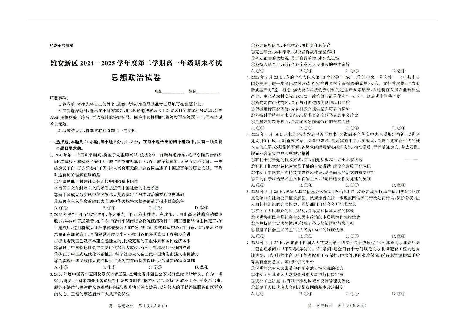 高一政治--河北省雄安新区雄安十校2024-2025学年高一下学期期末考试