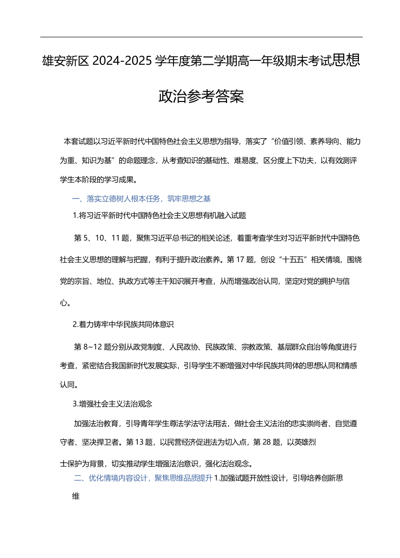 高一政治答案--河北省雄安新区雄安十校2024-2025学年高一下学期期末考试
