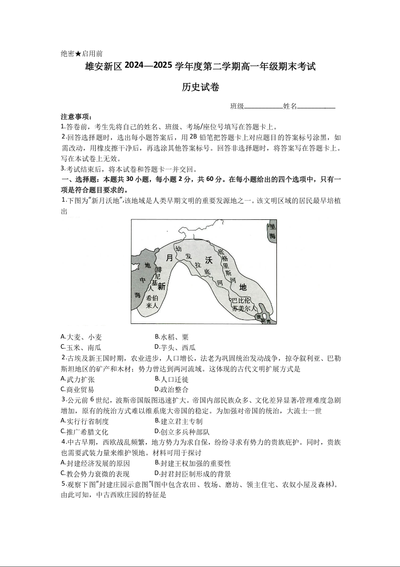 高一历史--河北省雄安新区雄安十校2024-2025学年高一下学期期末考试