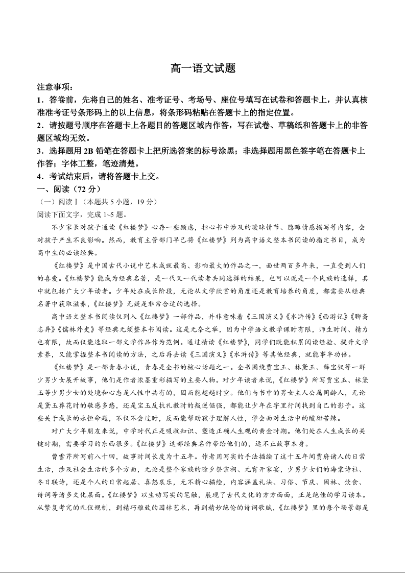 高一语文+答案--山东省滨州市2024-2025学年高一下学期期末考试