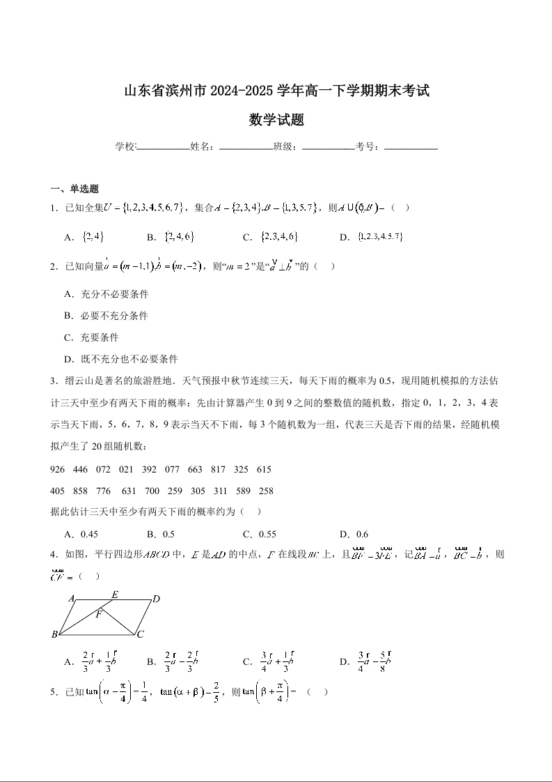 高一数学+答案--山东省滨州市2024-2025学年高一下学期期末考试