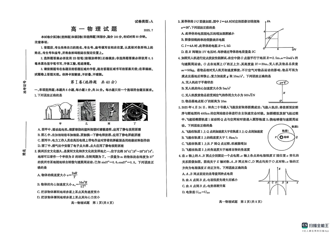 高一物理+答案--山东省滨州市2024-2025学年高一下学期期末考试