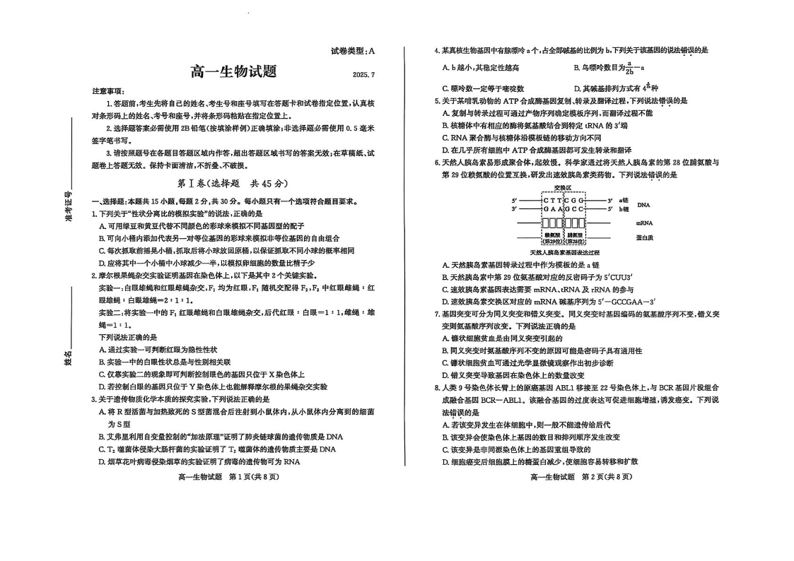 高一生物+答案--山东省滨州市2024-2025学年高一下学期期末考试