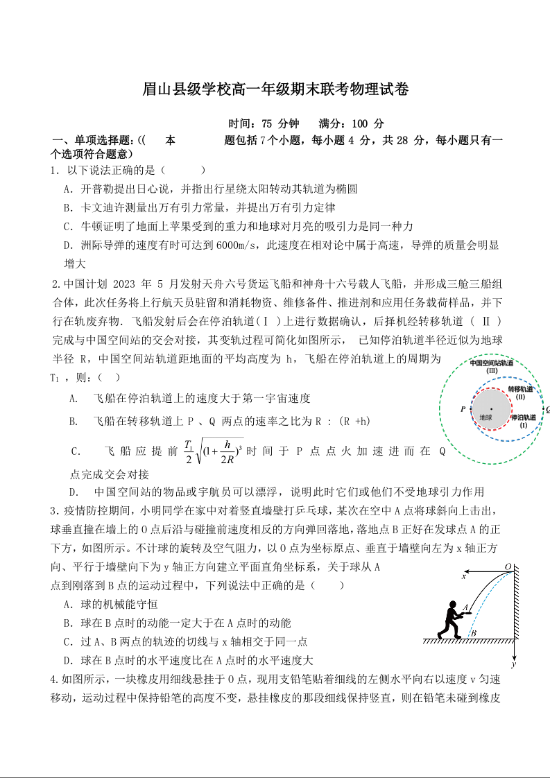 高一物理+答案--四川省眉山市县级学校2024-2025学年高一下学期期末联考