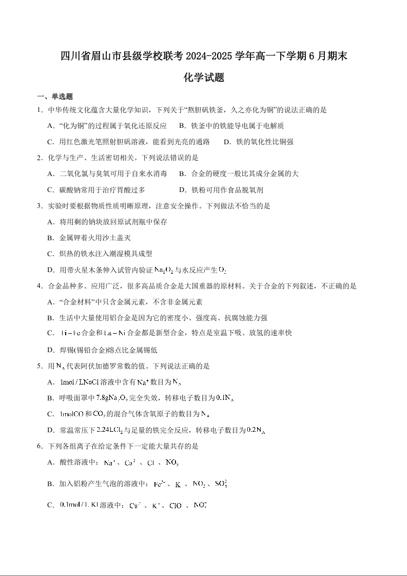 高一化学+答案--四川省眉山市县级学校2024-2025学年高一下学期期末联考
