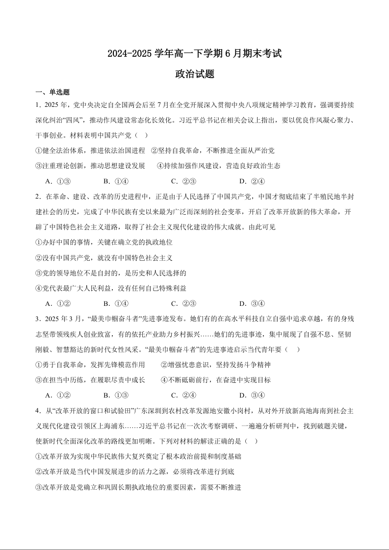 高一政治+答案--四川省眉山市县级学校2024-2025学年高一下学期期末联考