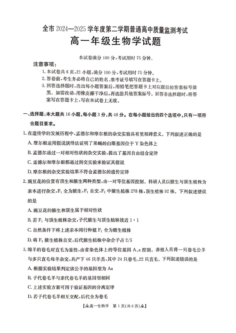 高一生物--贵州省安顺市2024-2025学年高一下学期期末考试
