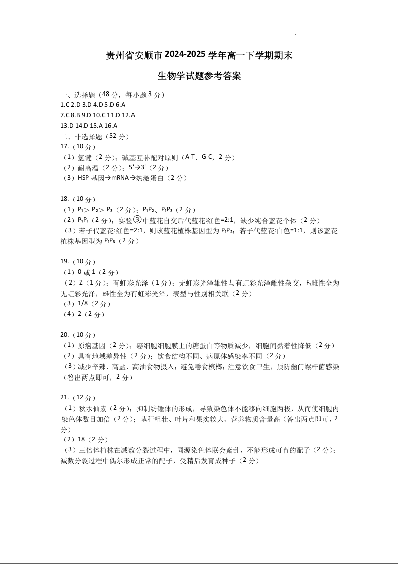 高一生物答案--贵州省安顺市2024-2025学年高一下学期期末考试