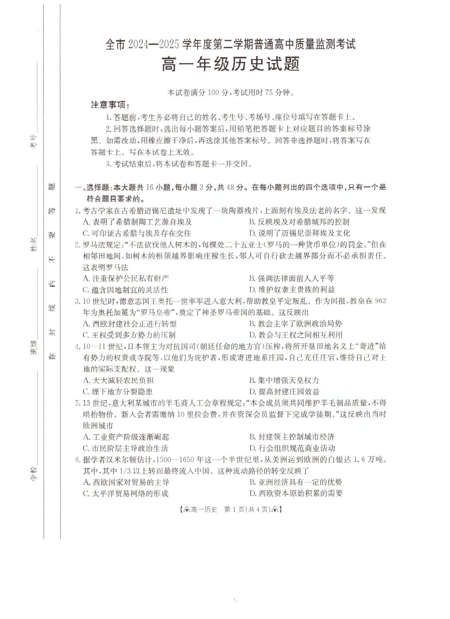 高一历史+答案--贵州省安顺市2024-2025学年高一下学期期末考试