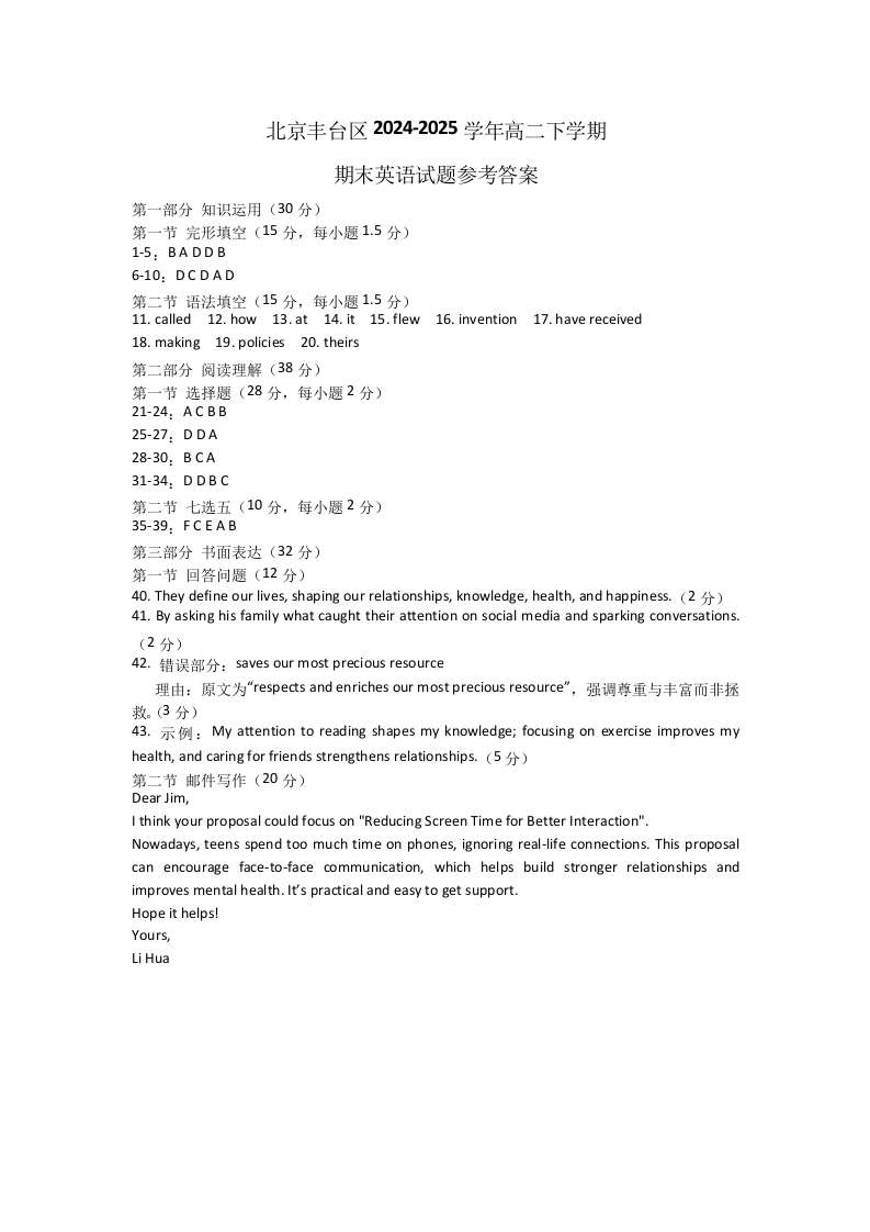 高二英语答案--北京市丰台区2024-2025学年高二下学期期末