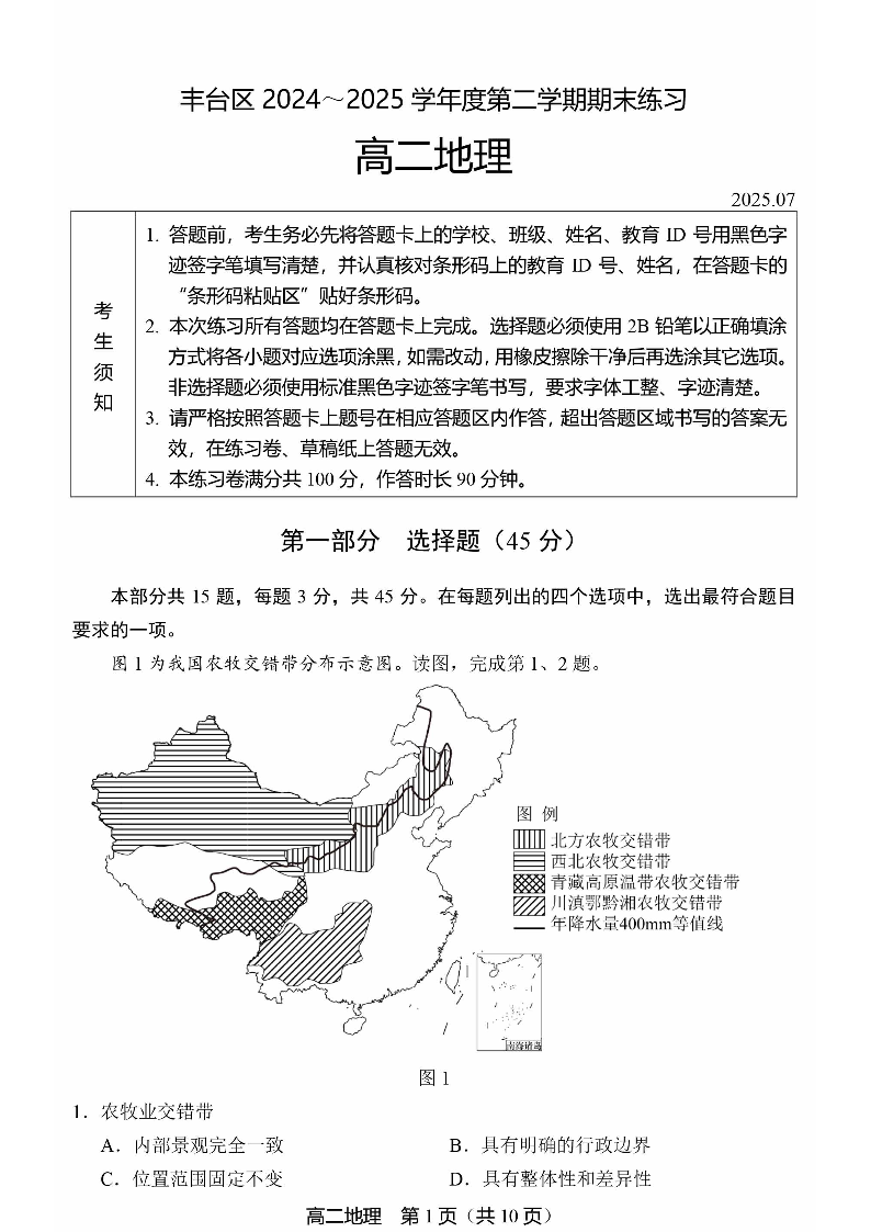 高二地理+答案--北京市丰台区2024-2025学年高二下学期期末