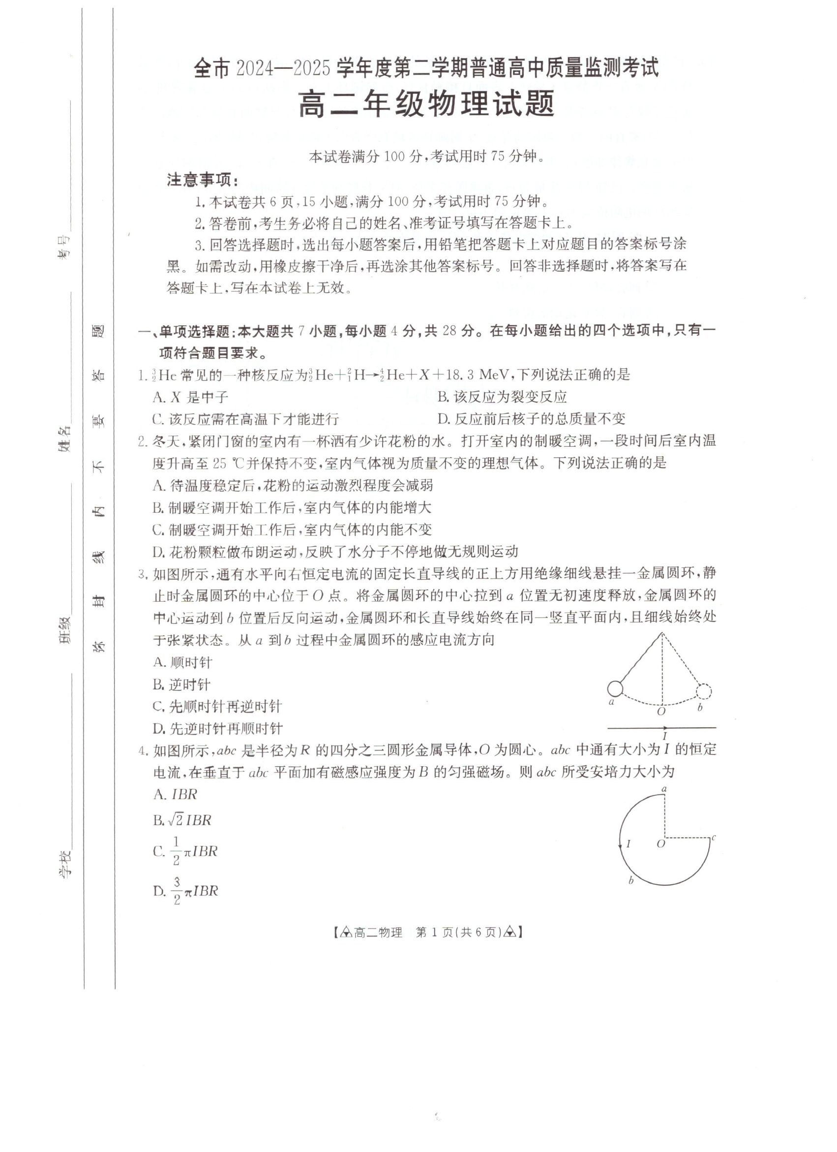 高二物理+答案--贵州省安顺市2024-2025学年高二下学期期末考试