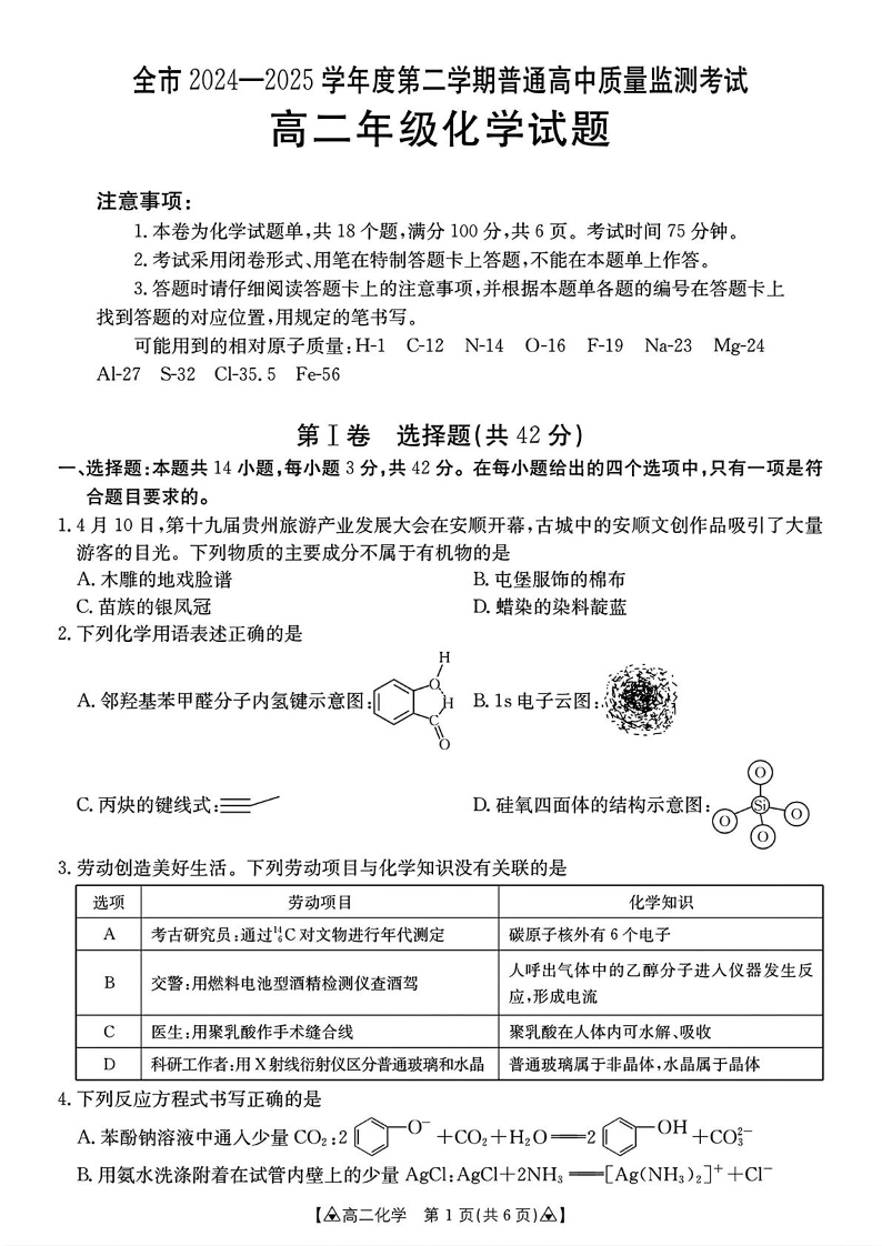 高二化学+答案--贵州省安顺市2024-2025学年高二下学期期末考试