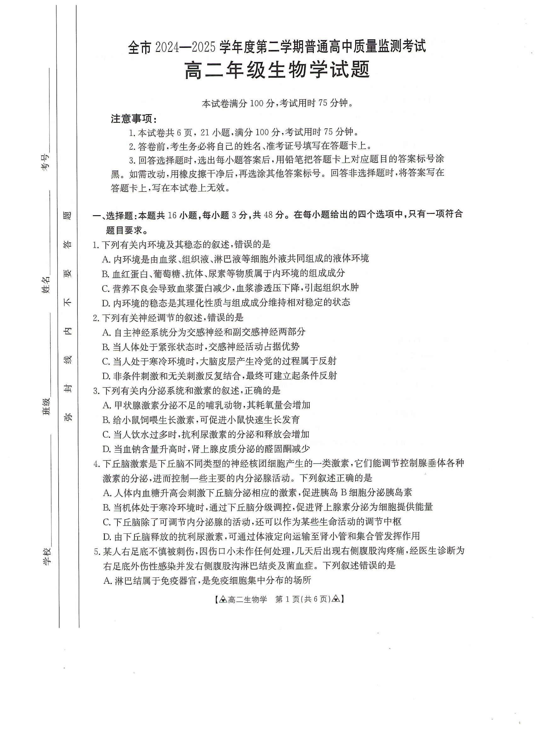 高二生物+答案--贵州省安顺市2024-2025学年高二下学期期末考试