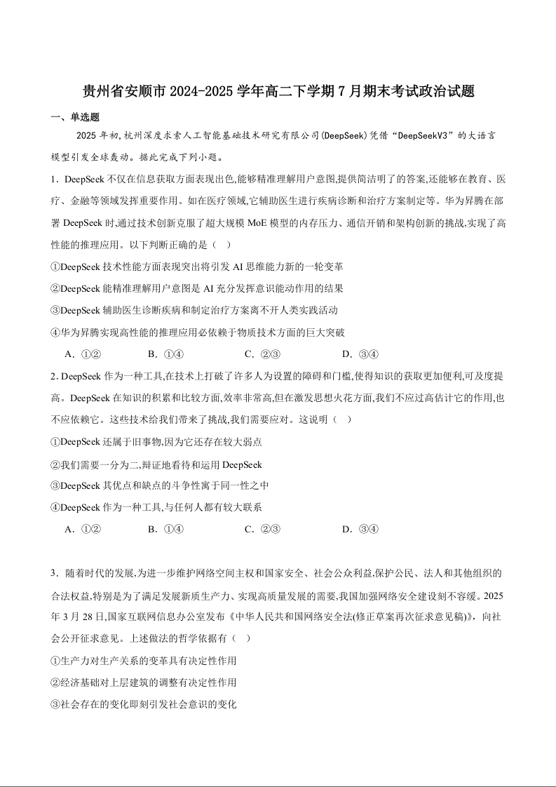 高二政治+答案--贵州省安顺市2024-2025学年高二下学期期末考试