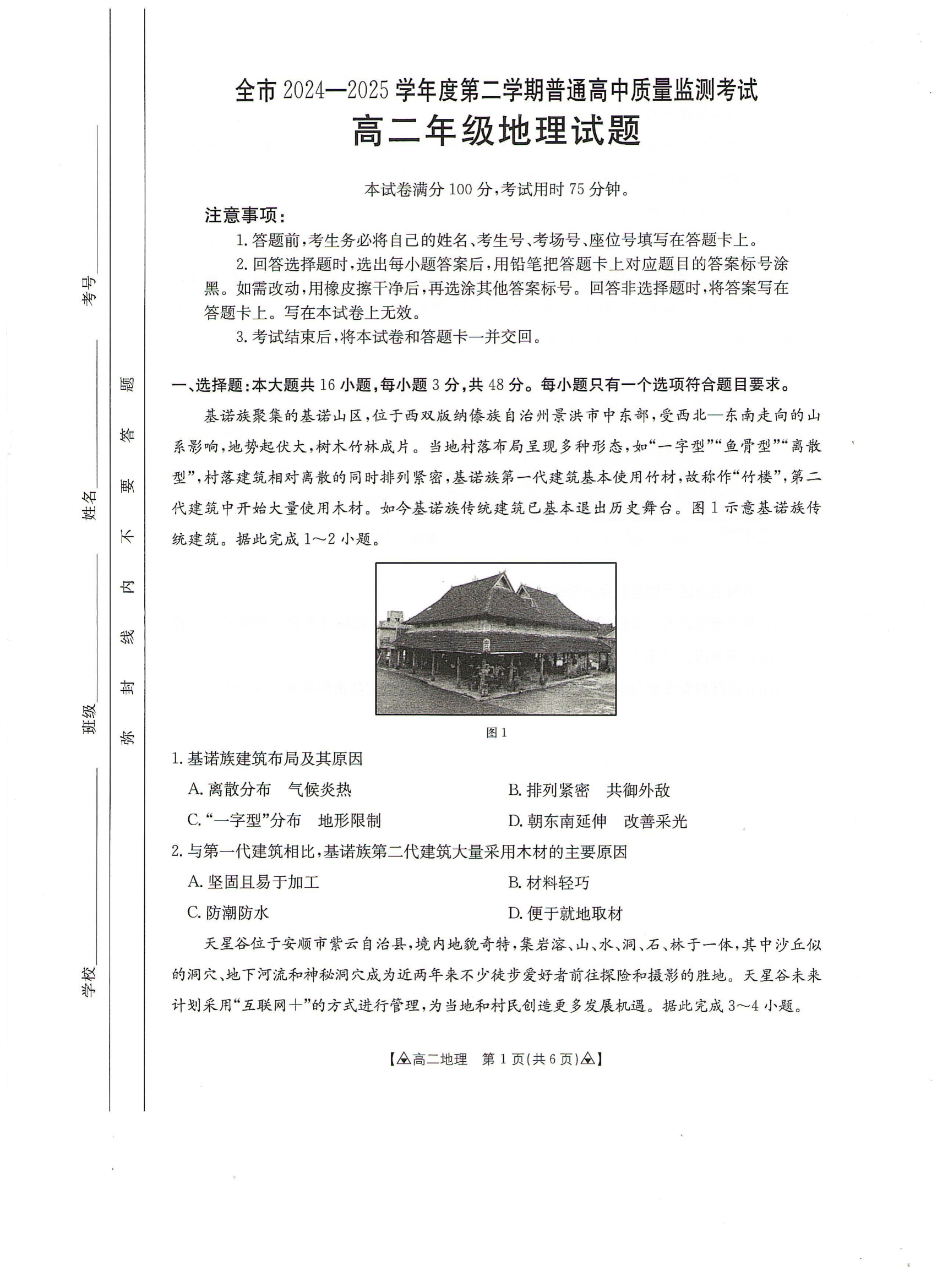 高二地理+答案--贵州省安顺市2024-2025学年高二下学期期末考试