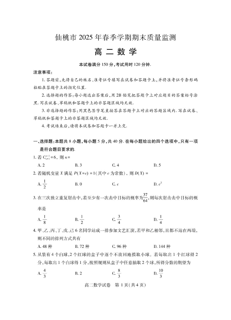 高二数学+答案--湖北省仙桃市2024-2025学年高二下学期期末考试