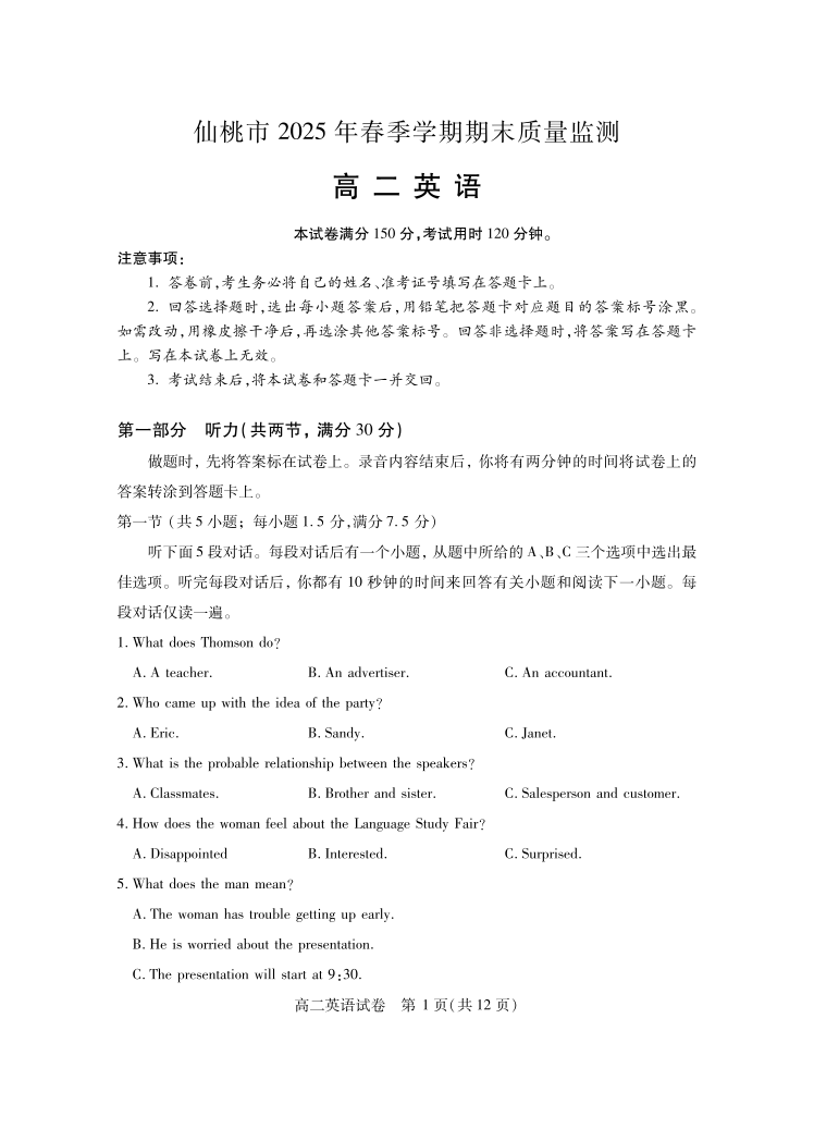 高二英语+答案--湖北省仙桃市2024-2025学年高二下学期期末考试