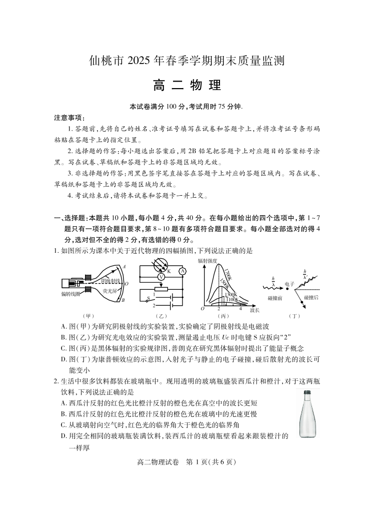 高二物理+答案--湖北省仙桃市2024-2025学年高二下学期期末考试