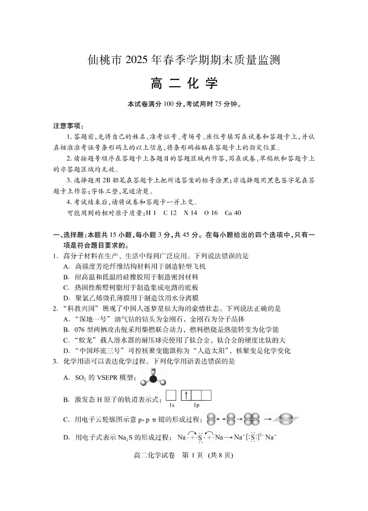 高二化学+答案--湖北省仙桃市2024-2025学年高二下学期期末考试
