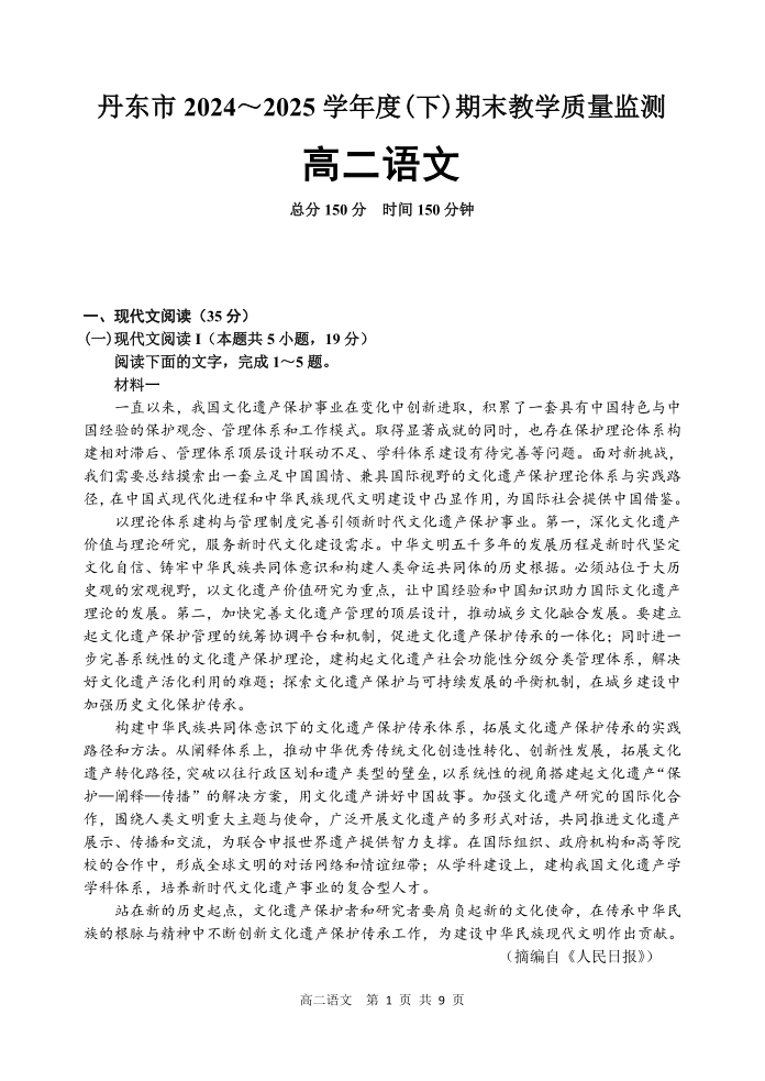 高二语文--辽宁省丹东市2024-2025学年高二下学期期末教学质量监测