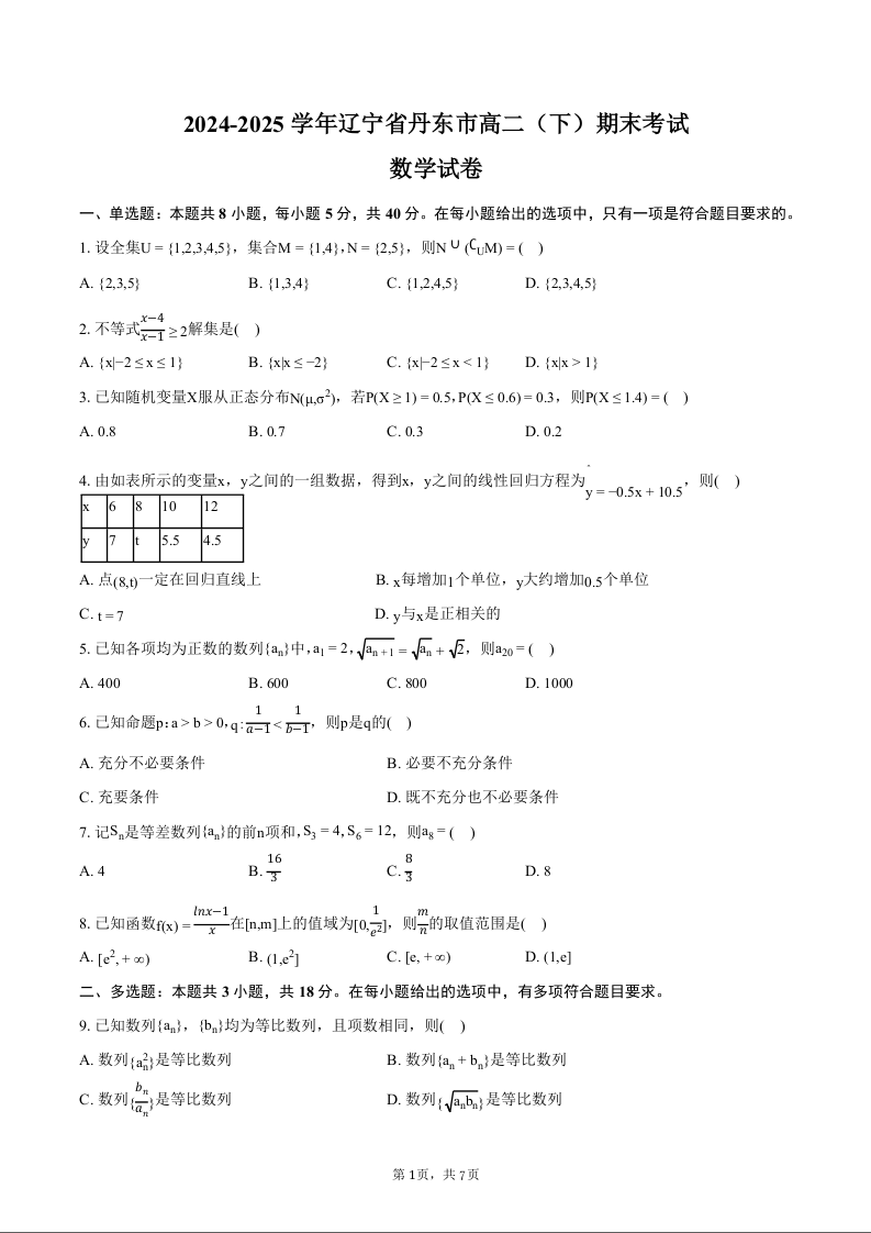 高二数学答案--辽宁省丹东市2024-2025学年高二下学期期末教学质量监测