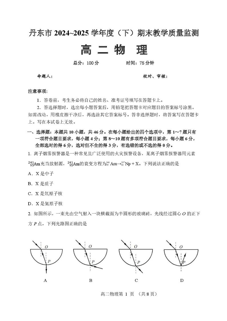 高二物理+答案--辽宁省丹东市2024-2025学年高二下学期期末教学质量监测
