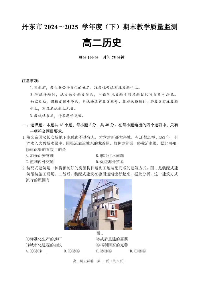 高二历史--辽宁省丹东市2024-2025学年高二下学期期末教学质量监测