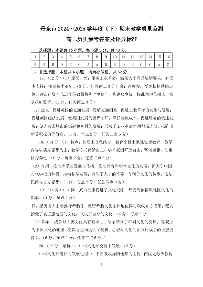 高二历史答案--辽宁省丹东市2024-2025学年高二下学期期末教学质量监测