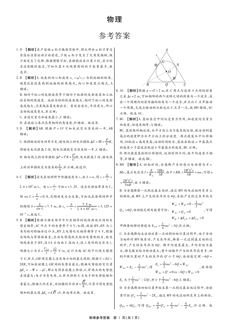 广西省2024届高中毕业班第一次摸底测试物理答案