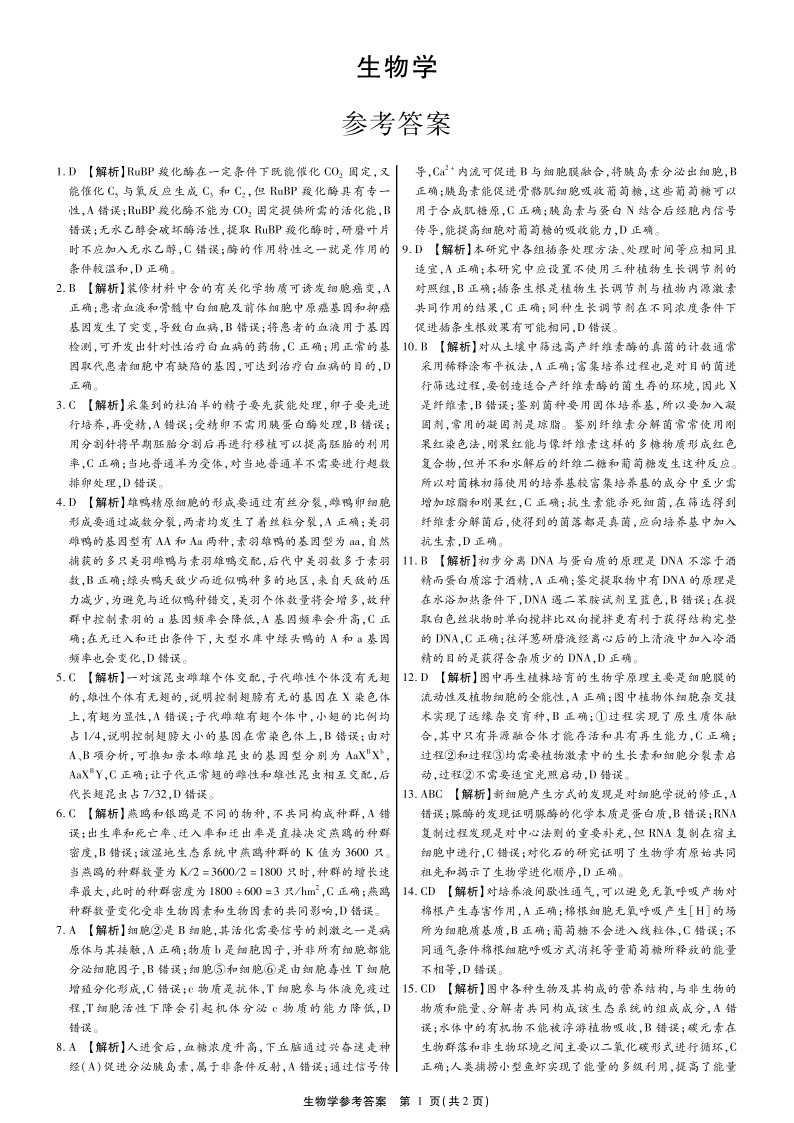 广西省2024届高中毕业班第一次摸底测试生物答案
