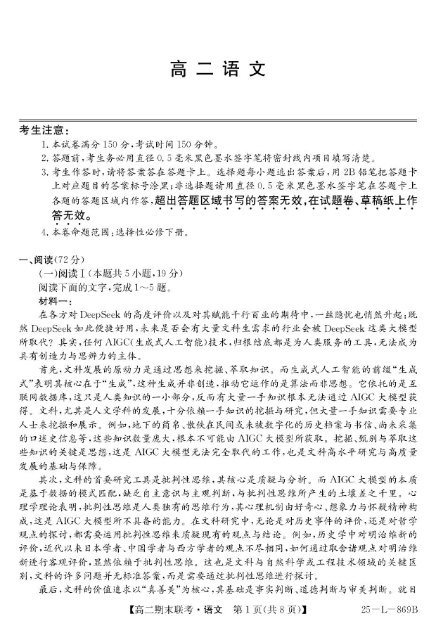 高二语文+答案--青海省西宁市大通县2024-2025学年高二下学期期末联考