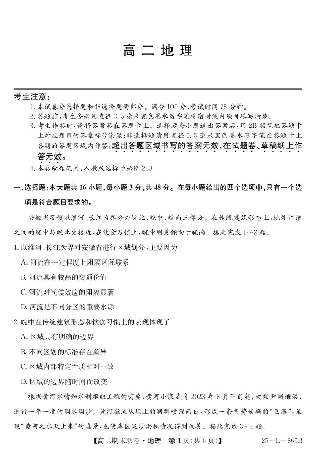 高二地理+答案--青海省西宁市大通县2024-2025学年高二下学期期末联考