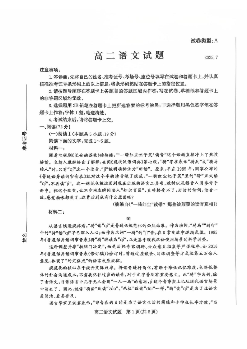 高二语文+答案--山东省滨州市2024-2025学年高二下学期期末考试