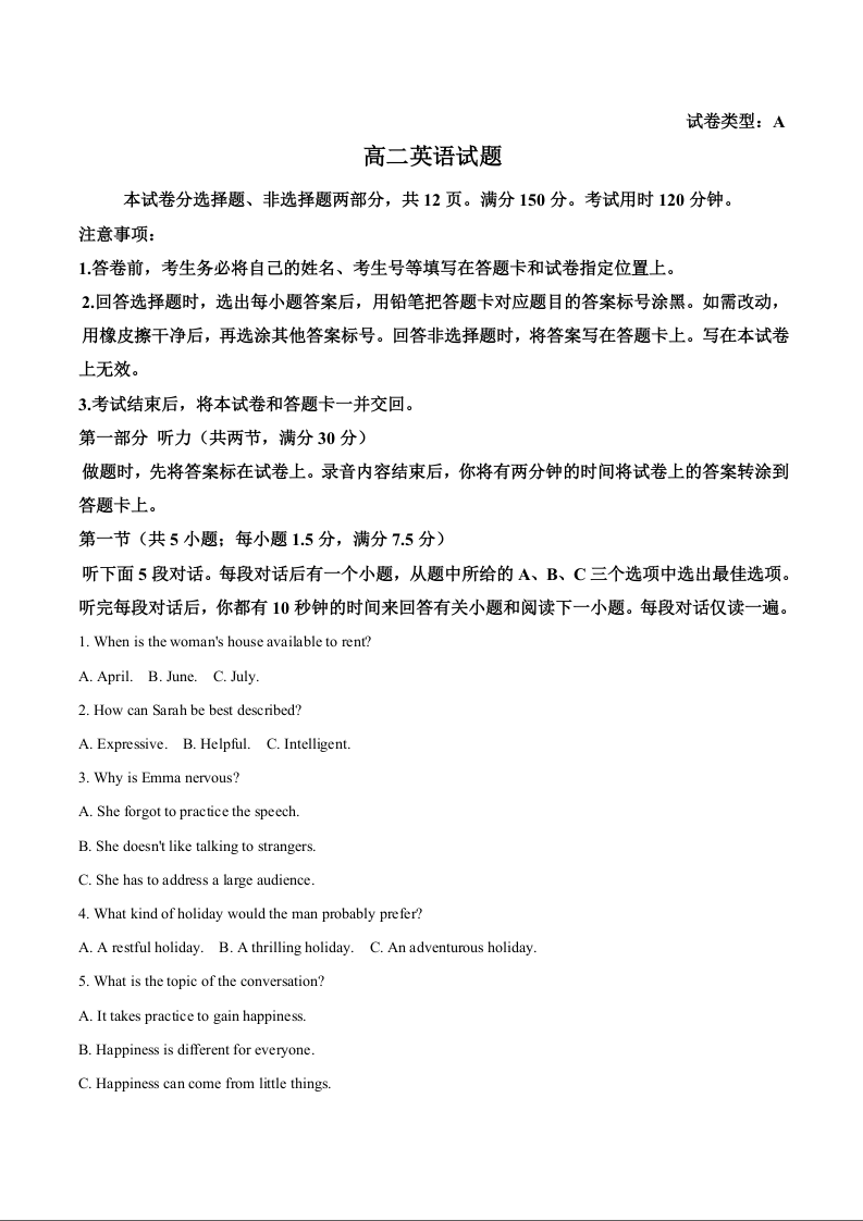 高二英语+答案--山东省滨州市2024-2025学年高二下学期期末考试